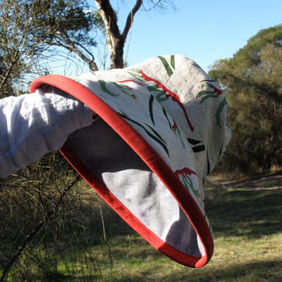 Design One: Sheoak – Casuarina, is commercially printed at Inkpot Studios on 100% linen and available in two colour combinations, Burgundy and Blue, and Orange and Green.